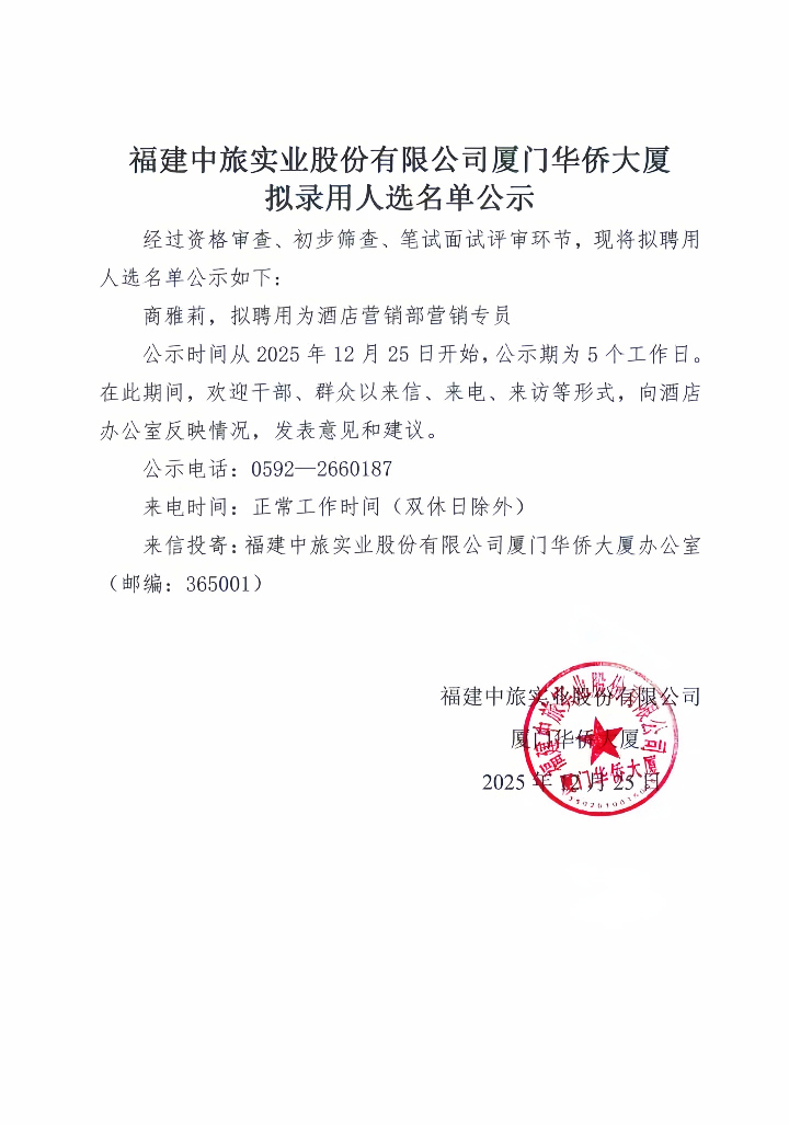 福建中旅实业股份有限公司厦门华侨大厦拟录用人选名单公示